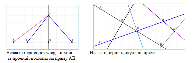 - 3. Фронтальна робота класу за готовими малюнками. Повторення означення та властивостей перпендикуляра.