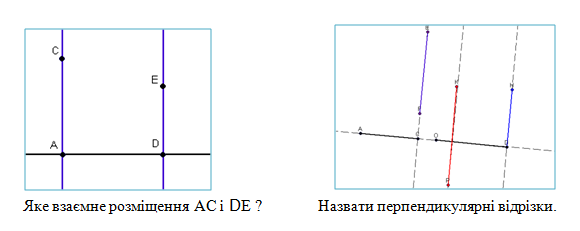 Мета уроку: закріпити навички використання вивчених властивостей до практичного застосування. Розвивати пам'ять, образне та логічне мислення, зв’язне логічне мовлення, навики роботи з перпендикулярними прямими та відрізками на площині. Виховувати наполегливість, відповідальність, самостійність, цілеспрямованість.